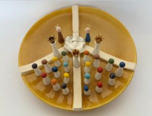 Custodi di pace 5 A Design Ceramica. L’opera rappresenta una reinterpretazione contemporanea della Sacra Famiglia, collocata al centro di un grande piatto circolare con il simbolo della pace. I personaggi sono rappresentati con forme stilizzate, essenziali e simboliche. Essa rappresenta il “Re” della pace, l’origine di un viaggio che non mira a vincere ma a unire. L’opera vuol essere una metafora potente, un messaggio di forte intensità: la vera mossa vincente è la pace e la Natività ne è il primo atto.